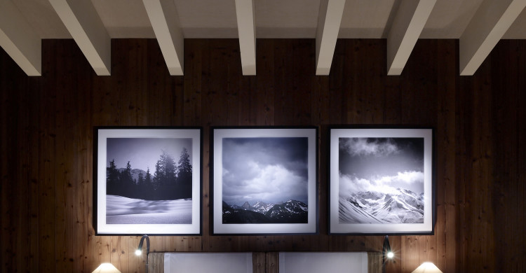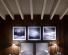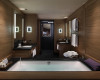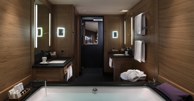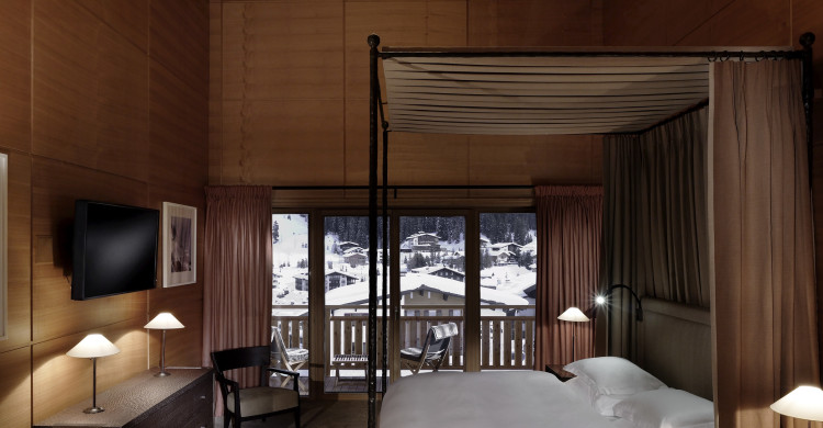 This double room with mountain views features modern elegance. The room includes a balcony, multi-media entertainment center, and a modern bathroom with a bathtub and rainfall shower.