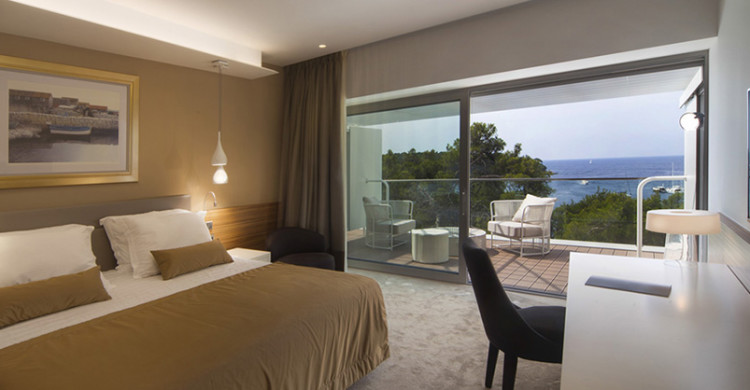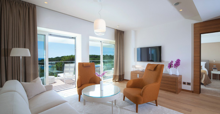 Bellevue suite has two double rooms (with two entrances), living room, two bathrooms, walk-in closet and a terrace. (93 sqm). The flooring is parquet or fitted carpet, and bathrooms are furnished with bathtub and shower, two sinks and bidet, hairdryer and high quality Natura Bissè toiletries. The terrace is equipped with Jacuzzi, deckchairs and patio furniture.