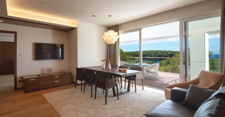 Presidential suite has three double rooms (with three entrances), two living rooms, four bathrooms, and toilet for visitors, kitchenette, two walk-in wardrobes and a terrace. (185 sqm).