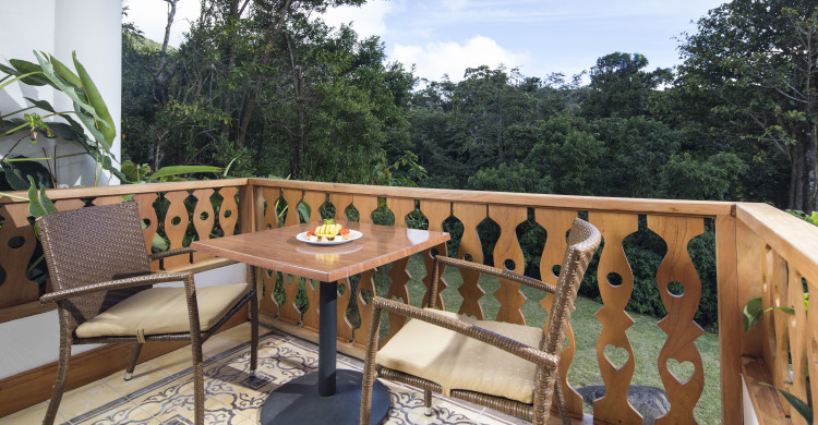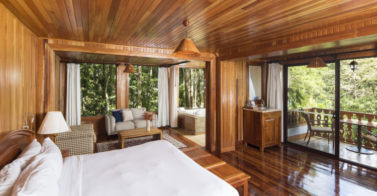 This room features floor to ceiling windows surrounded by stunning views of the cloud forest. Enjoy also a glass enclosed Jacuzzi, a balcony and an ample living area. Available with one king size bed or option to add a full size additional bed. A great alternative for friends or family. Equipped with a king size bed and a shower.