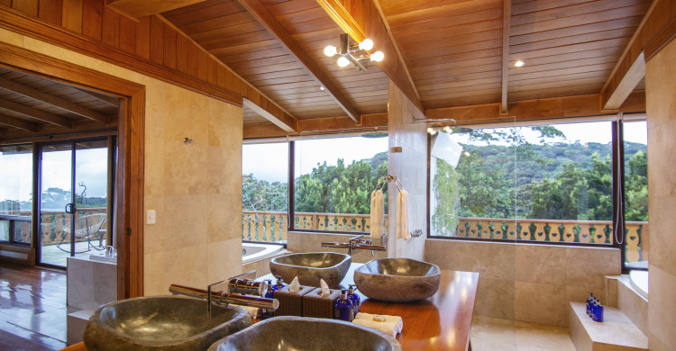 Offers 270-degree views of the mountains of the Monteverde Cloud Forest on one side and the Nicoya Peninsula on the other. Enjoy an incredible bird-watching experience from your private 30m2 terrace, or unwind in your own two-person whirlpool Jacuzzi. With floor-to-ceiling windows on all sides, this room offers some of the very best views in the entire hotel. Includes a seating area and a large bathroom with a double vanity and large open-concept shower overlooking the forest.