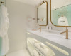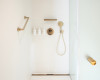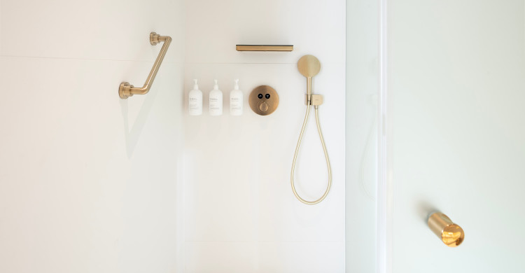 Bathroom with Italian shower. Premium quality bathroom products - Eco-friendly and recyclable dispensers Hairdryer Makeup mirror Bathrobes and slippers