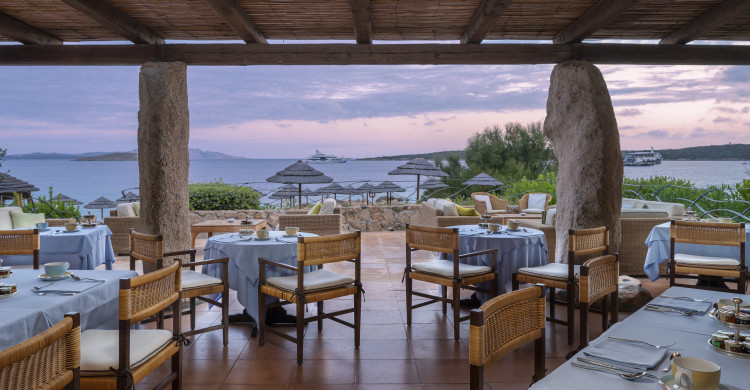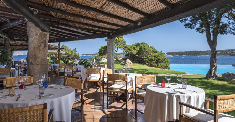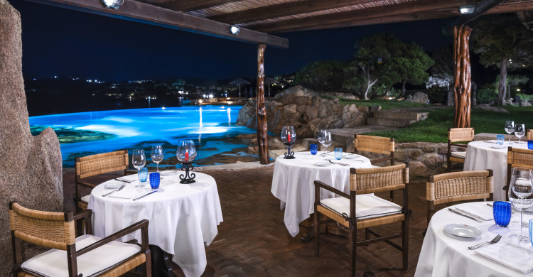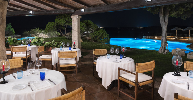 PITRIZZA RESTAURANT Serving refined and contemporary Mediterranean delicacies, a sophisticated dining destination offering stunning views of the dazzling Liscia di Vacca bay and the granite pool and lush gardens of the hotel.