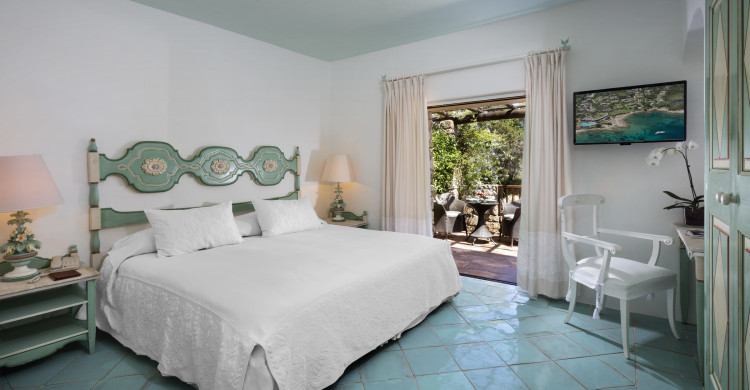 DELUXE SUITE (31-46 SQ.MT.) Deluxe Suites provide views of the lush hotel gardens or the sparkling sea; they also include a private terrace and a Sardinian-style living area that is ample and enchanting, as sun-bleached colors meet indigenous wood and granite.