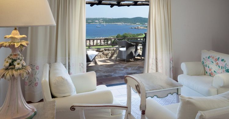 PREMIUM ROOM (26 SQ. MT.) The Premium Rooms are spacious double rooms decorated with white walls and dark wood furniture as in authentic Sardinian style. The bathrooms feature a rainforest shower enclosed in glass, bathtub, hairdryer, bathrobe, complimentary toiletries and telephone. All rooms feature a wide terrace facing the sparkling Liscia di Vacca Bay.
