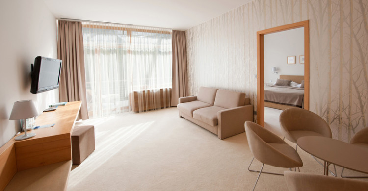 Suite has a spacious terrace with lounge chairs and a magnificent view of the mountains. (48 sqm). The room has a king-size bed and pull-out couch and can accommodate three adults or two adults and two children.