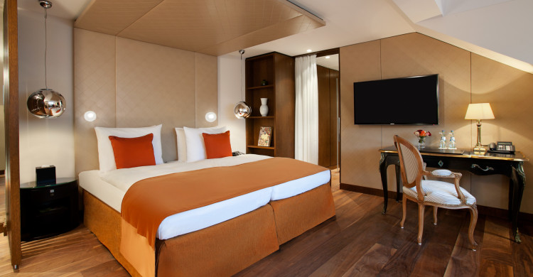 30 – 40 sqm View over the famous Maximilianstreet Modern and luxurious design King bed Desk Bathroom with heated mirror and integrated TV screen
