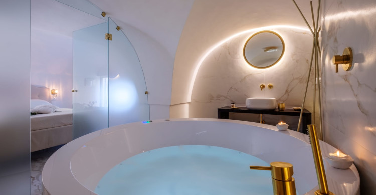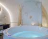 A double bed and a whirlpool tub located at the foot of the bed welcome you.