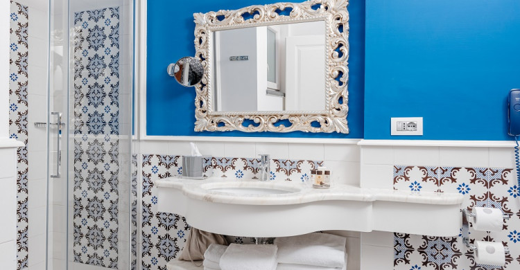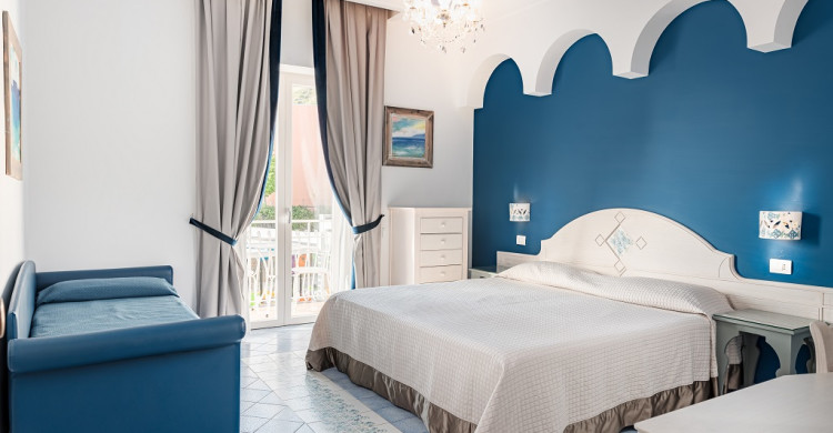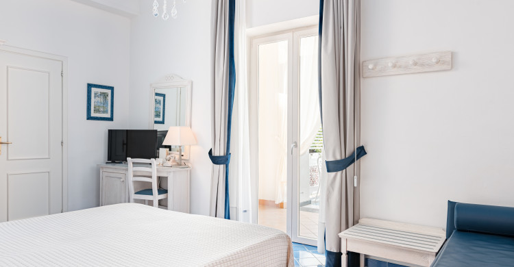 Sunny and bright thanks to the particular reflections of the hand-painted Vietri ceramics and the elegant furnishings with a pickled finish, the Superior rooms open onto our garden with a terrace or double balcony from which the guest can enjoy the colors of the sea and the scents of the nature that blend into an intoxicating mix of quiet and relaxation. These outdoor spaces are equipped with a table, chairs, sun lounger and armchair. The bathrooms are equipped with comfortable showers and decorated with Vietri marble and ceramics.
