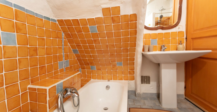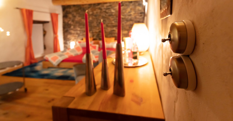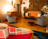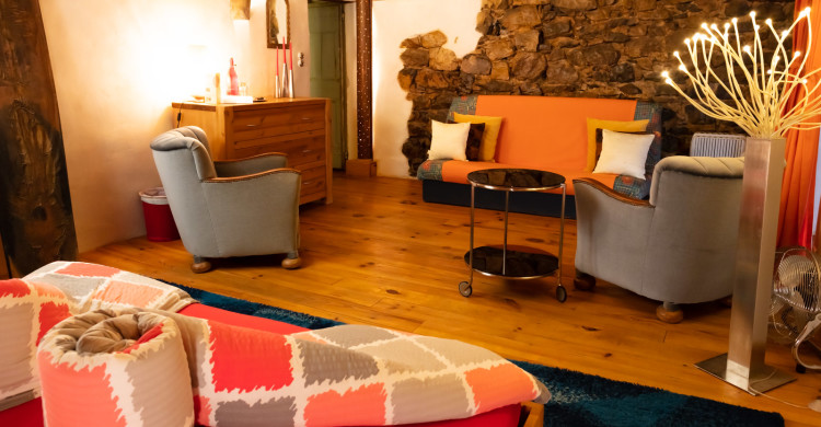 Enjoy the peace and quiet in this elegant 26 m² guest room, decorated in soothing blue and orange tones. Equipped with a king-size bed, a bathroom opposite the room with a shower and bathtub, a sink and toilet. This room is ideal for a relaxing and comfortable stay with lounge chairs and a sofa. The rate for the orange guest room includes breakfast.