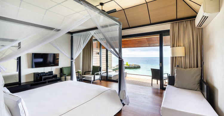 4-posterQueen-sizebed|Air-conditioning |CeilingFan|Nespresso machine and tea making facilities |SafetyBox |Wifi |DVDplayer| Home Theatre system | 1 Flat Screen Satellite TV | Semi-Outdoor Bathroom with Jacuzzi bathtub and shower |life jacket, hair dryer, direct access to the sea, bathrobe, Bathroom kits