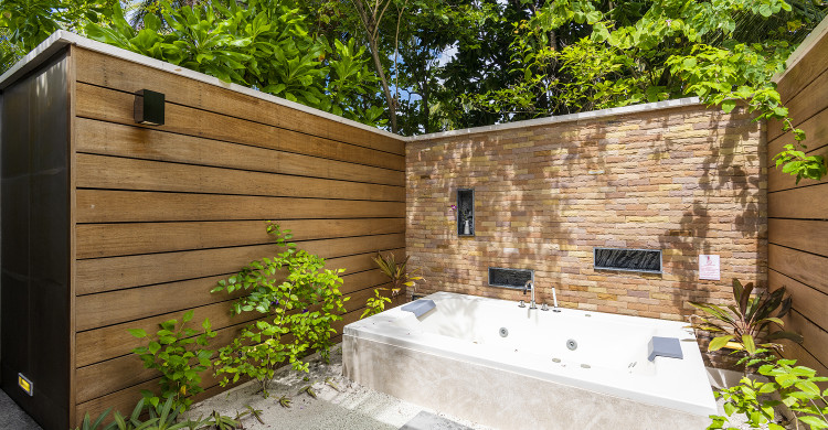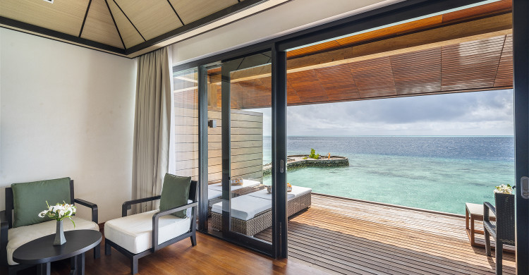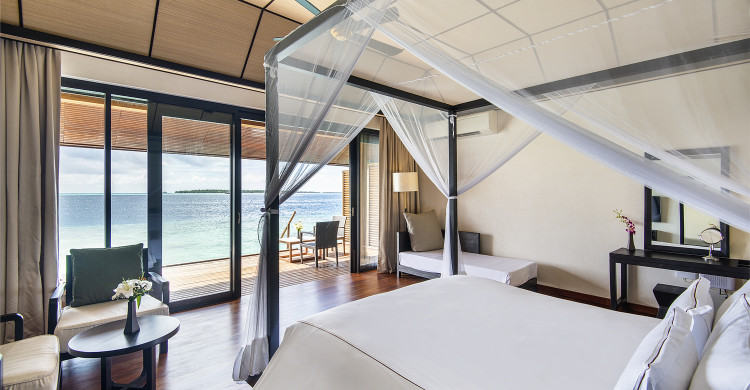 Maldivian beauty, wherever you look. Embedded in a tropical garden, the Lagoon Villa rises up above beach and water alike. Unique features: Sea facing 4-poster bed | direct access to the sea | semi outdoor bathroom.