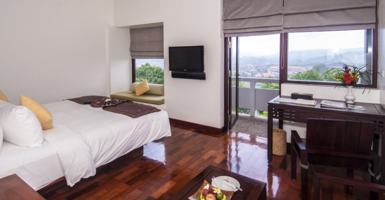 Elegant interior design and decorated with furniture and accessories crafted from locally sourced materials. Superior suite come with specious bathroom separate bathtub, and rain shower. (68 sqm). Superior King Rooms are located on the upper levels of the property – poised to take advantage of the magnificent views from the hill top over looking LuangPrabang local country side.