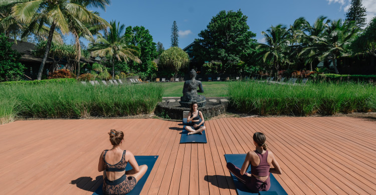 This 750 square foot indoor space is equipped with yoga props, including mats, bolsters, straps and blankets. This room is utilized for a variety of classes daily and can be transformed into a meeting room for private conferences and workshops for up to 40 people at our Maui retreat.