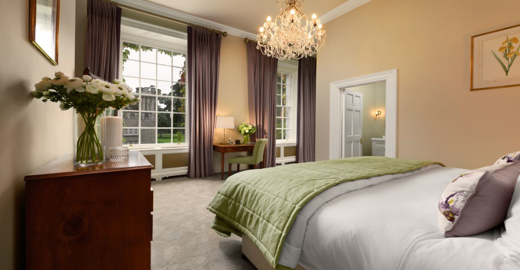 In 1831, famous writer Prince Pückler Muskan visited Luttrellstown Castle. He was so taken by the beauty of the surrounding landscape that he wrote about the Glen and its ‘Gay shrubs and wild flowers, the softest turf and giant trees, festooned with creeping plants, fill the narrow glen through which the path winds.’ This beautiful bedroom takes inspiration from his memorable words, mixing the softest hues of the fabrics and furnishings with the natural light that comes in through the ornate windows. At the centre of this cosy space lies a magnificent king-size bed draped in luxurious 100% cotton monogrammed linen. Above it hangs a glorious chandelier that provides an added touch of elegance to the effortlessly stylish surroundings. There’s also a fold-out sofa bed for additional guests. The en-suite includes a walk-in shower filled with luxurious Molton Brown bathroom beauty accessories.