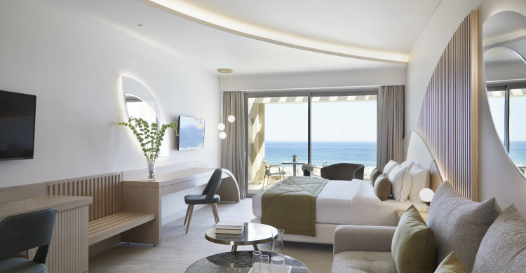 A stylish refuge for a memorable stay. The Junior Suite Sea View rooms combine spaciousness and elegance with luxury details and supreme amenities. They offer an open-plan arrangement featuring a sleeping area with a double or twin beds, and a sitting area with a sofa bed that can host one more guest.