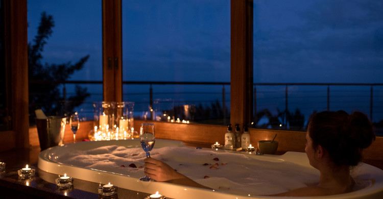 Each of the 4 Ocean Suites are free standing units beautifully placed amongst trees. The large lounge area opens onto a private wooden deck, providing a spectacular 180° view of the ocean and the reserve. The Ocean Suites are situated to provide absolute privacy and are furnished with a king size 4 poster bed, "his" and "hers" bathrooms with a jet bath and double shower, as well a coffee/tea station, mini bar and complimentary WiFi. These suites allow for private dining and spa treatments on the deck. For those families with small children a sleeper couch is available that can sleep 2 young children and cots can be arranged for babies.
