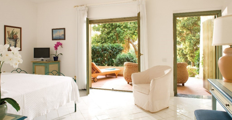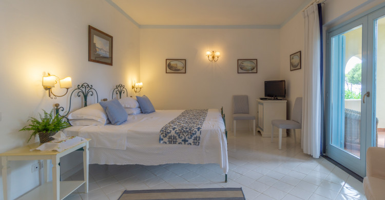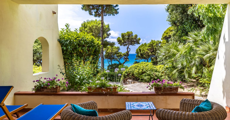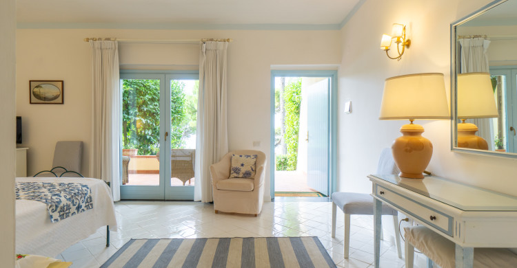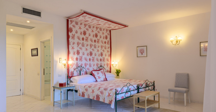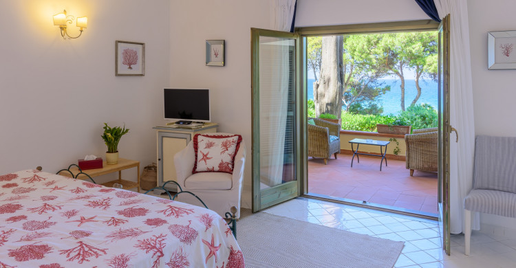 Offering Mediterranean Flair and stunning views over the sea and garden. It has a private patio. This modern style room is set on the ground floor of Villa Belmonte, embedded in the historical gardens of Palazzo Belmonte. The en-suite bathroom includes a bathtub with hand shower, the floor and bathroom are furnished with typical, handcrafted ceramic tiles.