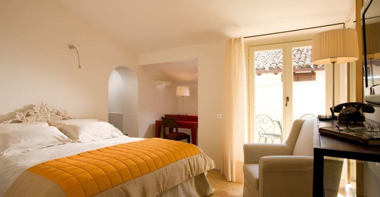 Intimacy is the added value of Palazzo Seneca. Some rooms are decorated with wrought iron canopies, as of old, while others have wooden headboards carved by the expert hands of the Umbrian artisans, responsible for the restoration of important works of art in central Italy. Simmons mattress with springs individually bagged and memory foam will make your rest a real dream. Writing desks fully lined in leather by the master tanners from the Marche. ‘Cardinal’ chairs, the same used in the Vatican for meetings among cardinals, strictly made by Umbrian artisans. On the walls textural paintings made with jute, the fabric formerly used by bakers for the natural leavening of bread. Class and elegance characterize all the bathrooms of the rooms, made with ecru marble.