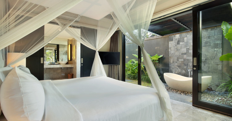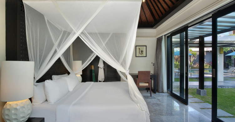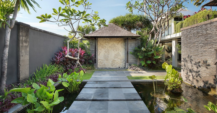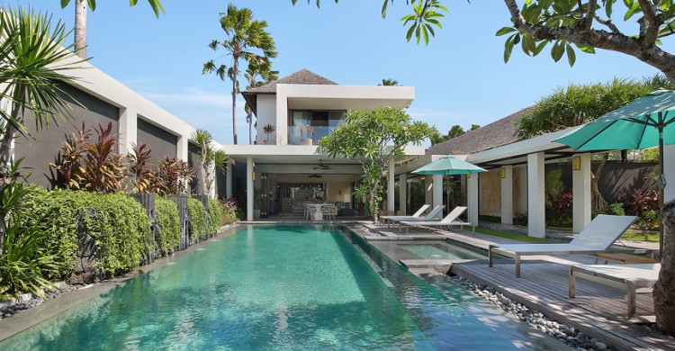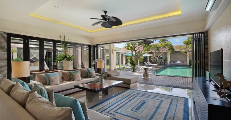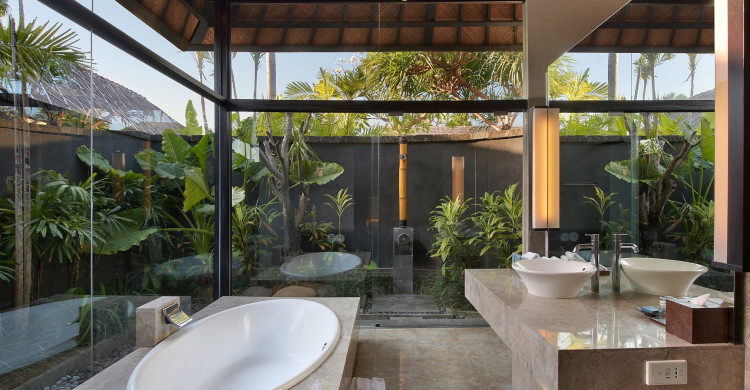 With 1050 square meters of land, the Presidential Villa makes a spacious living space for a big group travelling together, or an ideal space for intimate gatherings. Decorated with modern elegance, Peppers Seminyak's flagship villa is a blue and white oasis in sunny Bali. With five generously spacious bedrooms, the villa has everything you need to make a home away from home during your getaway in contemporary Balinese style. Featuring a 52 square meter private swimming pool with vines and waterfall, porcelain bathtubs, outdoor showers, sun loungers, poolside bar, full-sized gourmet kitchen, flat-screen television and satellite channels, with villa specific internet access.