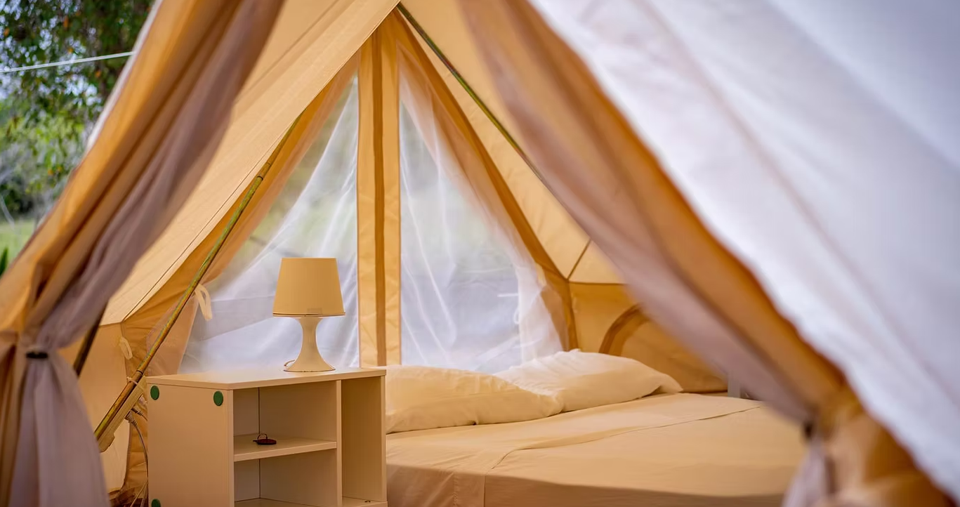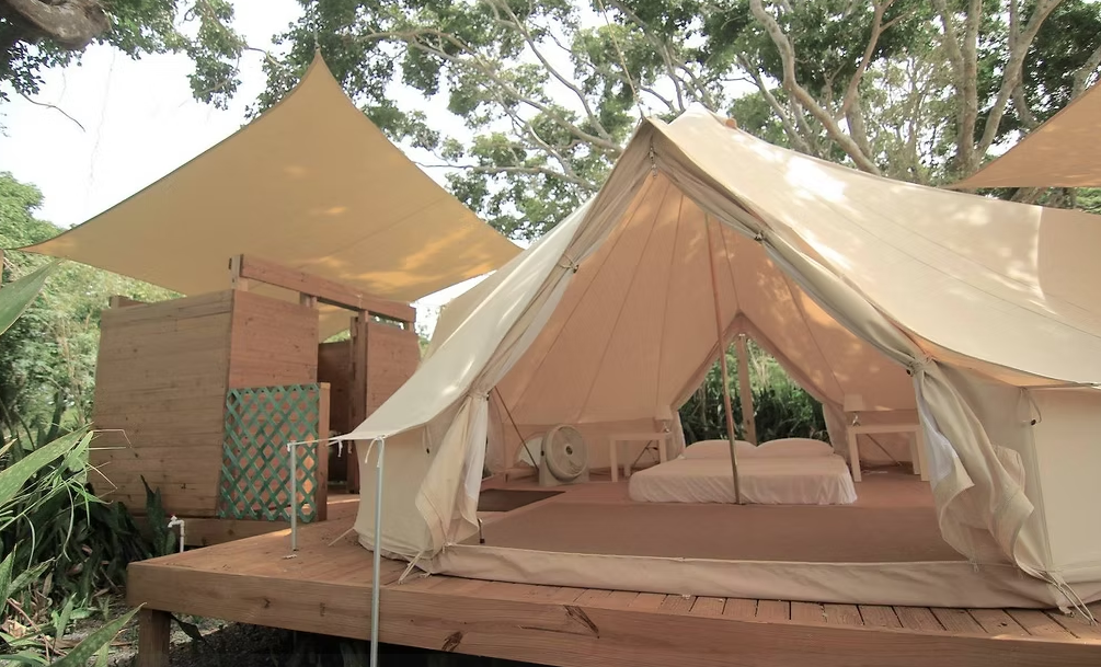 The retreat features five luxury tents, each thoughtfully positioned for privacy and tranquility. Every tent includes a queen bed, private bathroom with hot water, electricity, and a mini-kitchen stocked with essentials.