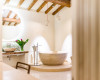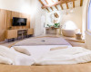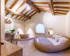 The so called “suppinna”, in which the servants of the residence once did the family’s laundry with wood ash, has been transformed into a beautiful room, where, once you enter, you can’t help noticing a succession of round forms, like the sophisticated round bed and the large and cosy round marble tub, the undisputed protagonists of the entire space. From here, there is a direct access to the roof garden.