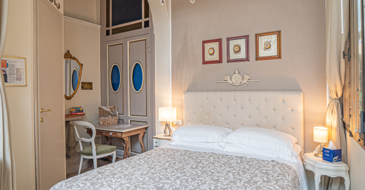 Suitable for two or three guests, this large sunny suite used to be the dressing room of the 'DIVA' of the small private theater that is part of this structure.  A King size bed as well as a third single bed makes this suite a triplet. Also, a couple of armchairs, throws, and other accessories make for comfortable seating and a beautiful original 19th-century wardrobe finishes the room. The bathroom is painted in a warm red color, decorated in terracotta tiles, and has a spacious shower, a sink, and a bidet.