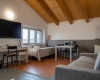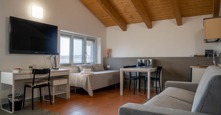 The romantic suite is a spacious and panoramic apartment on the first floor of the residence. It features a large living room with a fully equipped kitchen, a sofa, and a dining area, one bathroom, and a master bedroom.