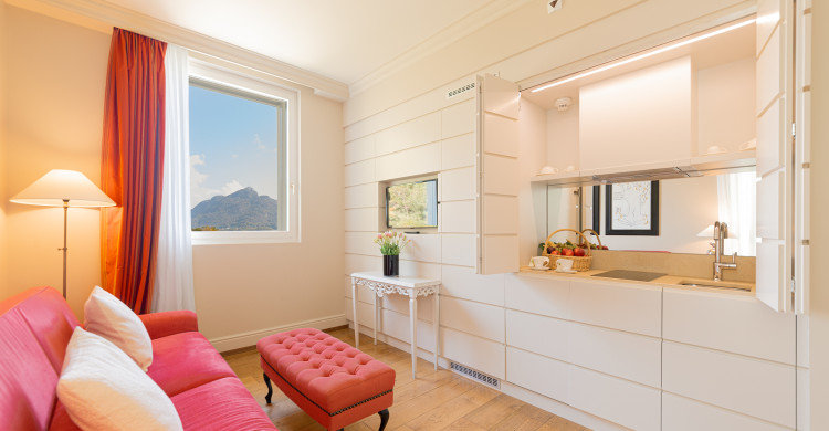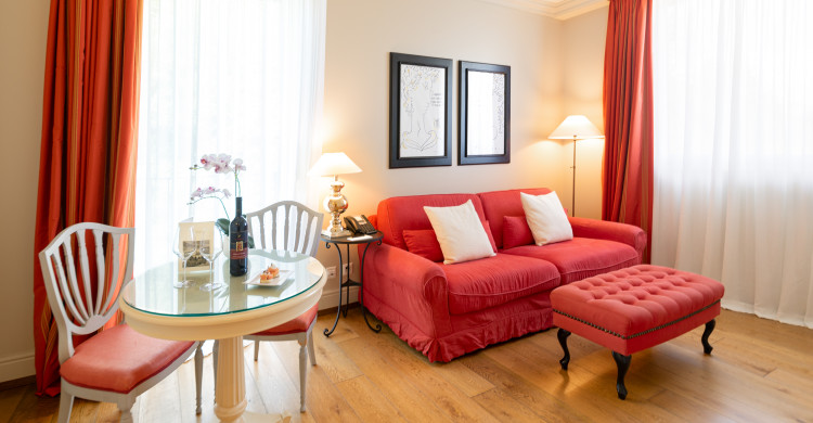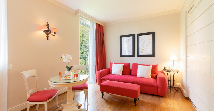 Junior Suites are approximately 52 square meters large, generously proportioned, bright and airy, and overlook either the back side of the building or the entrance of the Hotel. Stylishly furnished with carefully thought-out fittings, each Junior Suite includes a living room with fully-equipped kitchenette, separate double bedroom and a generous bathroom with shower.