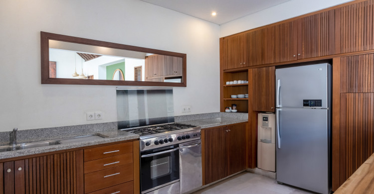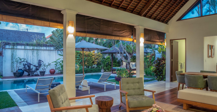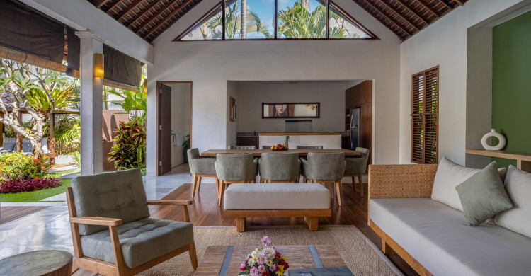 Embrace the tropical lifestyle and enjoy the beauty of the spacious open-sided dining and lounge pavilion at Villa Sadewa, which faces out to the garden and pool. This living space is decorated with unique artworks, furnished with a large comfortable sofa upholstered in bright crimson, and fitted with iPod speakers, making this the ideal spot to catch up with friends, read a book or enjoy cocktails and canapés at sunset. The dining table accommodates eight guests and the well-equipped kitchen is discreetly located behind the dining area.
