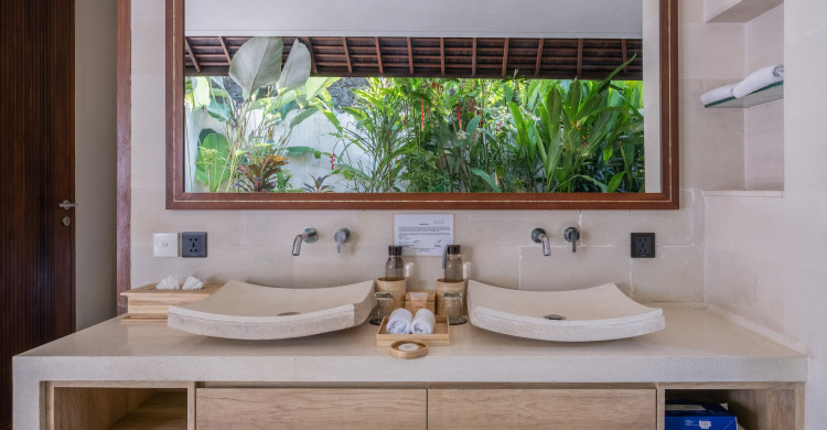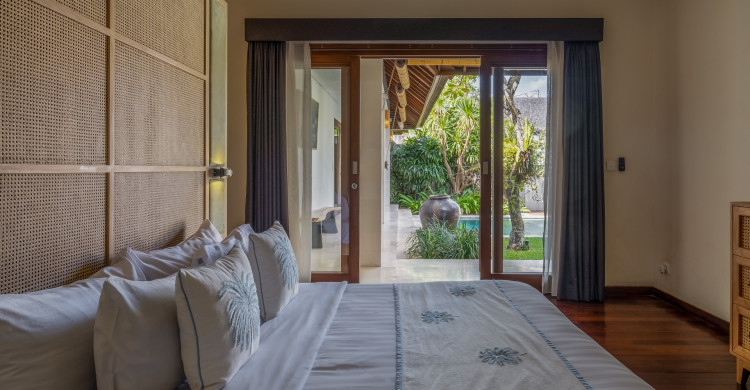 A large, sliding wall panel next to the pool separates Villa Sadewa from two-bedroom Villa Nakula. Guests who book both villas can request the staff to open the wall panel to provide a joined garden area with the two swimming pools – ideal for family groups requiring four bedrooms and space for the children to have fun.
