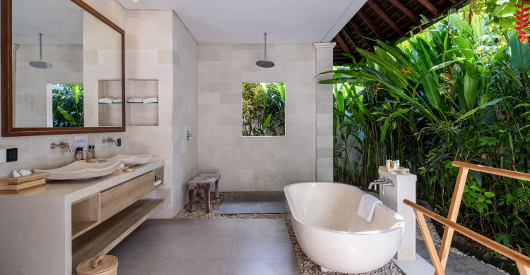 As well as two spacious ensuite bedrooms, Villa Sadewa has a large open-air living/dining area, complemented by a separate, fully equipped kitchen. A 13-metre pool with a timber deck and a comfortable relaxation bale are set within the villa’s lovely tropical garden.