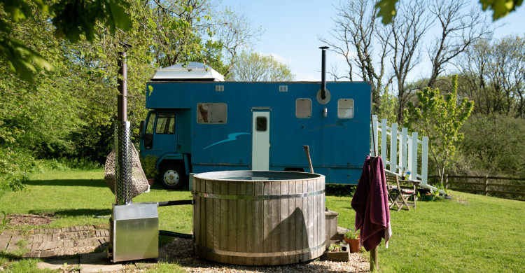 Perfect for couples, Big Blue features a comfy double bed, a small kitchen, a wood-burning stove, and a compact ensuite loo. For a proper pamper, step into Bertha—your private shower trailer with plenty of hot water and comfort.