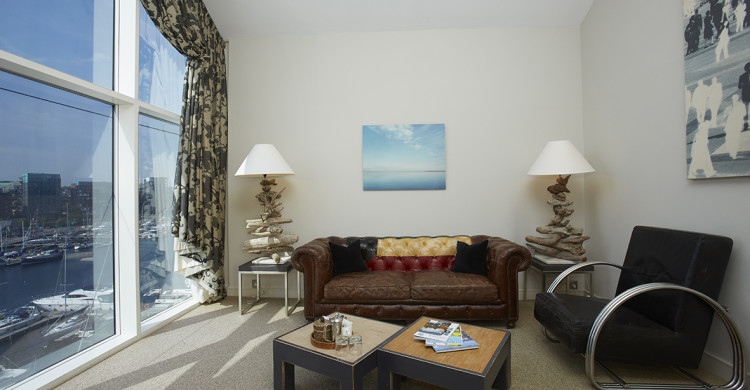 Super kingsize bed, Panoramic view of the marina, Large bathroom featuring freestanding power shower and separate bath, Temple Spa toiletries, Fluffy bathrobes, Relaxing lounge area, Air conditioned room, Flat screen TV, Cafetiere coffee and luxury teas, Bose ipod dock, Complimentary WIFI