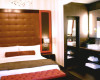 Standard room with One Queen. The guest room is decorated with a rich warm palette that includes deep orange, chocolate brown and cognac. Leather headboards and crystal chandeliers add a touch of glamour, with pillow-top mattresses that compliment imported European sheets, duvets and peek-a-boo shower. Complimentary Breakfast Buffet, WiFi internet access, local and toll-free calls, and gym pass to Equinox Fitness Center nearby. No facility fees!