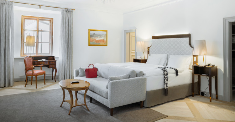 The 95 m² Traditional Suites offer a luxurious ambience. High quality flooring, stylish furnishings and a marble bathroom underline the exquisite design of these suites. Couples enjoy the spacious living area as well as romantic sleeping room with integrated dressing room. The stunning view of the impressive mountain scenery of the Styrian Alps creates a very special romantic setting.