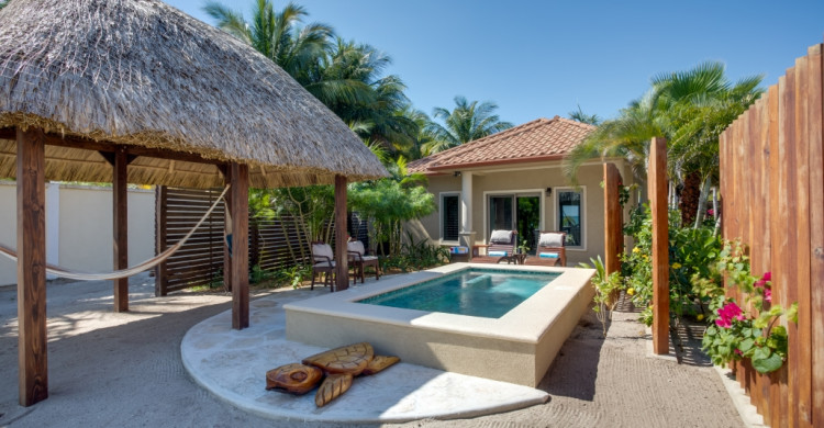 This cozy villa is perfect for a honeymoon or romantic getaway. Situated right on the beach, you'll find everything you need. Turtle features one queen bedroom with full bathroom (single vanity, walk in shower), living area, fully equipped kitchen. Enjoy the small relaxation pool and the palapa on the beach.