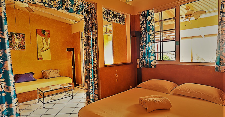 A large and comfortable studio, the bedroom area separated from the living room, a well equipped kitchen, a bathroom with shower and toilet. A large terrace with "lazy corner" and dining table. All air-conditioned and superb views of the lagoon and the mountain.