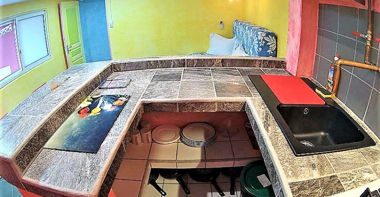 A tiny studio just for 2 people. Nestled in a pretty garden, rocked by the sound of a small waterfall. A well equipped kitchen and a bathroom complete this quiet accommodation. A large shared terrace offers a beautiful view of the lagoon.
