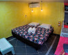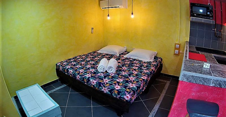A queen size bed, air conditioning, kitchen and private bathroom.