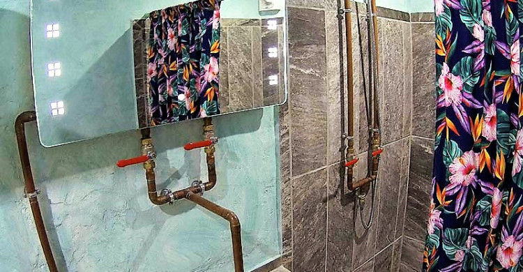 A queen size bed, air conditioning, kitchen and private bathroom.