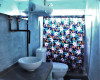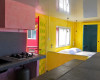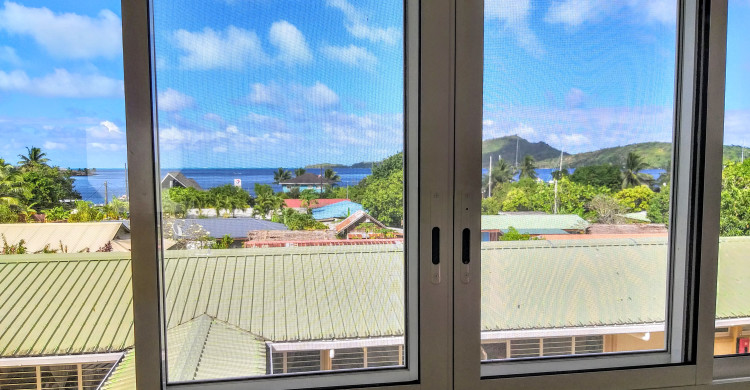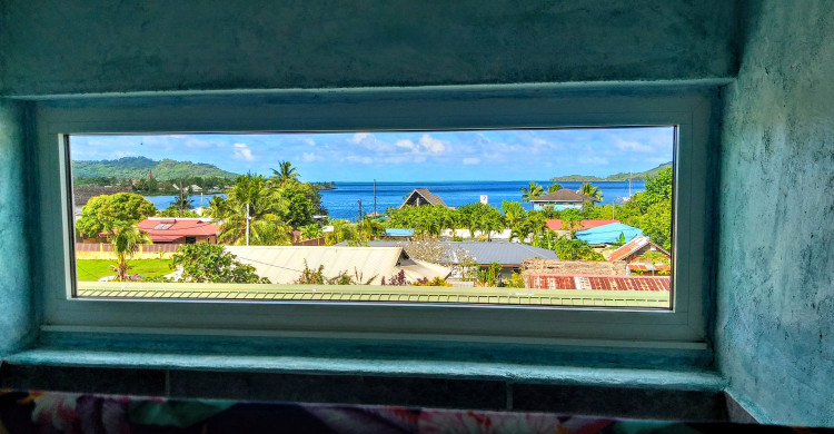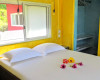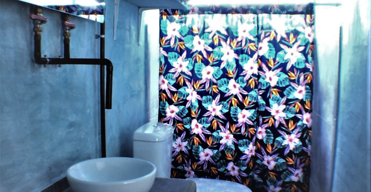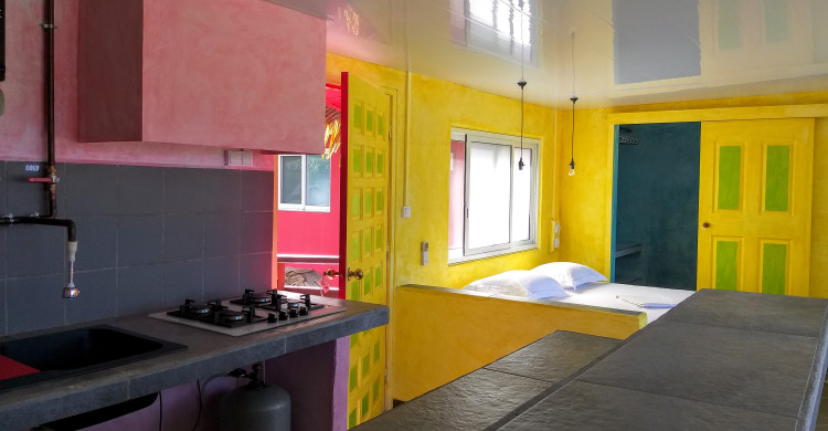 A queen size bed, air conditioning, kitchen and private bathroom.