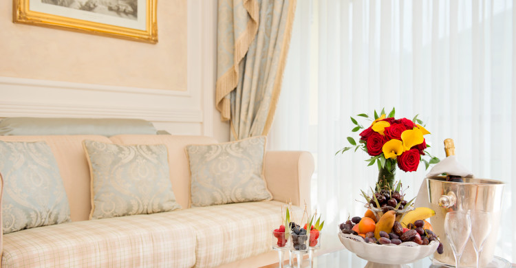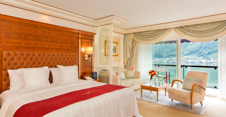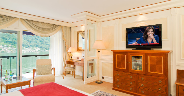 Deluxe double rooms, with outstanding view with its balcony overlooking the enchanting Ceresio lake and the surrounding mountains. Comfortable and elegantly furnished living area with sofa, armchair, table and desk LCD television with interactive, internet and Wi-Fi, safe and minibar. The bathroom is lavishly decorated in marble, includes bath with shower, towel rails and steam-resistant mirror. Measure 40sqm