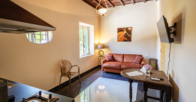 The room is elegant and comfortable with a view on the delightful internal courtyard. It has a fully equipped kitchenette with Nespresso machine and complimentary capsules. The room has all the comforts: air conditioning, wifi, TV. Double sofa bed. Large bathroom with Jacuzzi, bathroom amenities. Complimentary water. Complimentary courtesy slippers.