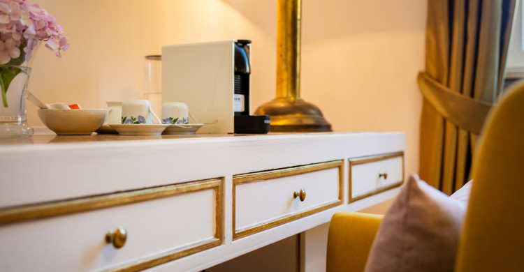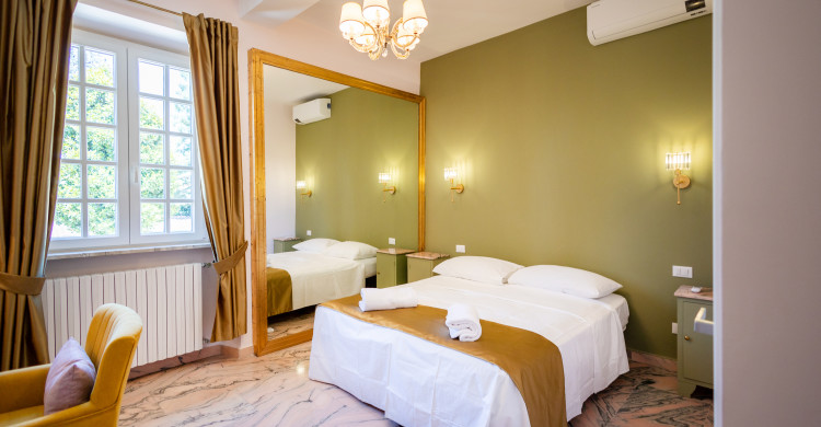An elegant and comfortable room, which has all comforts: air conditioning, wifi, TV, hairdryer. Possibility of double bed or two single beds. Bathroom amenities, Nespresso machine for morning coffee with complimentary capsules, complimentary water, courtesy slippers. View on the garden