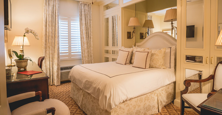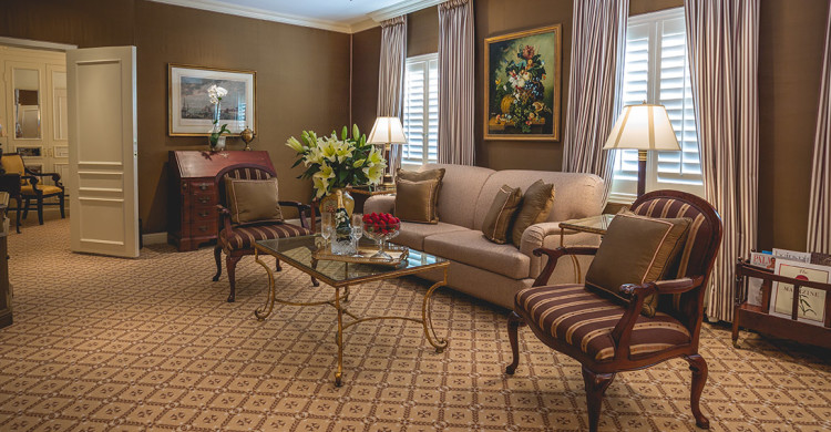 This very unique accommodation is comprised of a Queen Superior bedroom at either end, each with distinct decor and separate marble bathroom, and a large, classically furnished living room in between with a third bath featuring a walk-in shower.