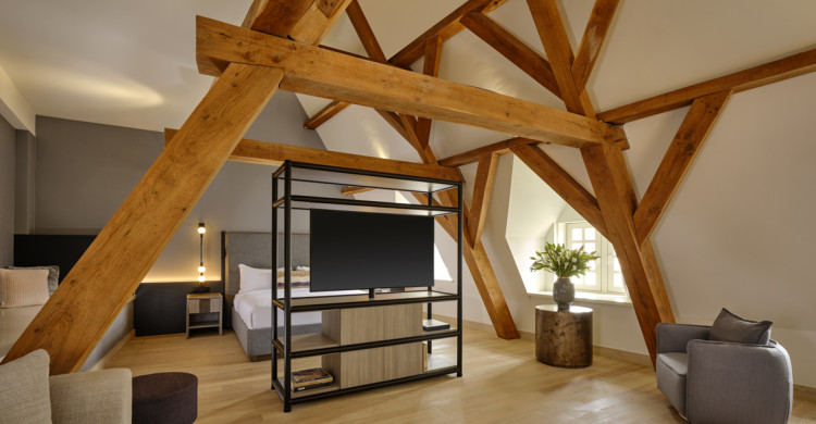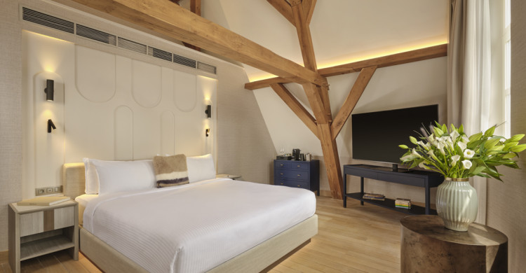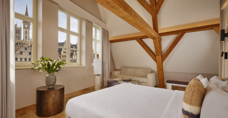 The Leie River Suite at Ghent Marriott is a luxurious and spacious suite designed to showcase the charm of historic Ghent from one of its most iconic riverfront locations. Nestled under beautiful exposed beams with refined, contemporary décor, this suite offers elegant living space and panoramic views over the gentle flow of the River Leie, making it an ideal setting for a romantic getaway or a serene urban retreat. From enjoying a morning espresso with a river panorama to unwinding in the peaceful lounge as daylight shifts across the water, every detail is thoughtfully curated to create a timeless and relaxed stay right in the heart of the city.
