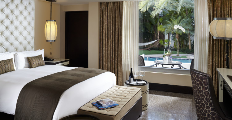 Our newly-renovated Miami Beach luxury accommodations tie enviable views to elegant furnishings, underscoring your stay with artful intrigue. New furniture has been custom designed in the exotic hardwood Sapele, known for its rich reddish-brown tones, with a distinct piano finish. Bed frames, desks, and entertainment console corners are capped with chrome plate accents creating a rich and original feel.