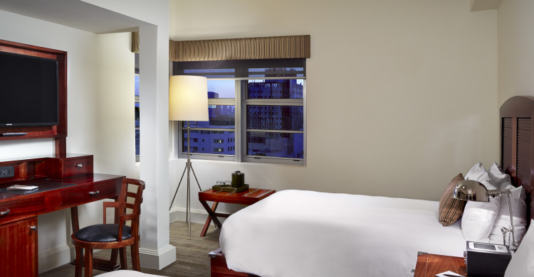 Take in an Art Deco view in a tastefully appointed guestroom featuring a TV w/DVD player and pay-per-view movies. Our very own National Hotel bath amenities make for a very luxurious bath experience. Enjoy a restful night’s sleep on our pillow-top mattress and European cotton linens with a down comforter and feather pillows. Other amenities include an alarm clock with CD player, terry robes & slippers, full size iron and board and hairdryer. Stay connected to friends and family with our High-Speed Wireless access. Same day valet laundry service and a fully-stocked mini bar are available along with our 24-hour Award Winning Concierge Services. This non-smoking room also comes equipped with a work desk, comfortable lounge chair and side table.