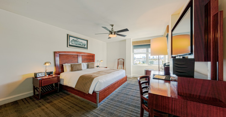 Take in an Art Deco view in a tastefully appointed guestroom featuring a TV w/DVD player and pay-per-view movies. Our very own National Hotel bath amenities make for a very luxurious bath experience. Enjoy a restful night’s sleep on our pillow-top mattress and European cotton linens with a down comforter and feather pillows. Other amenities include an alarm clock with CD player, terry robes & slippers, full size iron and board and hairdryer. Stay connected to friends and family with our High-Speed Wireless access. Same day valet laundry service and a fully-stocked mini bar are available along with our 24-hour Award Winning Concierge Services. This non-smoking room also comes equipped with a work desk, comfortable lounge chair and side table.